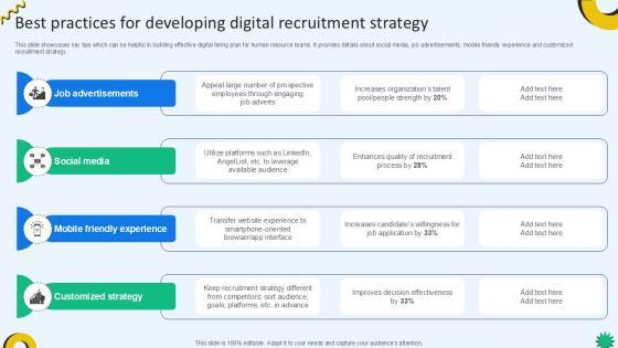This slide showcases key tips which can be helpful in building effective digital hiring plan for human resource teams. It provides details about social media, job advertisements, mobile friendly experience and customized recruitment strategy. Slidegeeks is one of the best resources for PowerPoint templates. You can download easily and regulate Best Practices For Developing Digital Cloud Recruiting Technologies PPT Sample for your personal presentations from our wonderful collection. A few clicks is all it takes to discover and get the most relevant and appropriate templates. Use our Templates to add a unique zing and appeal to your presentation and meetings. All the slides are easy to edit and you can use them even for advertisement purposes. This slide showcases key tips which can be helpful in building effective digital hiring plan for human resource teams. It provides details about social media, job advertisements, mobile friendly experience and customized recruitment strategy.