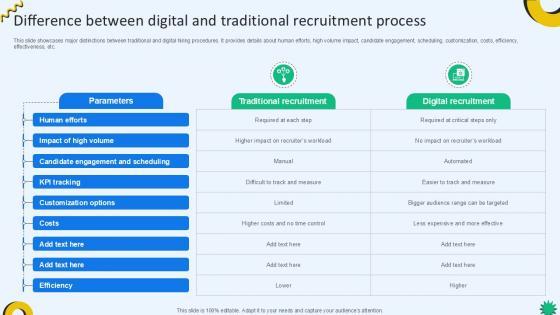 This slide showcases major distinctions between traditional and digital hiring procedures. It provides details about human efforts, high volume impact, candidate engagement, scheduling, customization, costs, efficiency, effectiveness, etc. Do you have an important presentation coming up Are you looking for something that will make your presentation stand out from the rest Look no further than Difference Between Digital And Traditional Enhancing Recruitment Process PPT PowerPoint. With our professional designs, you can trust that your presentation will pop and make delivering it a smooth process. And with Slidegeeks, you can trust that your presentation will be unique and memorable. So why wait Grab Difference Between Digital And Traditional Enhancing Recruitment Process PPT PowerPoint today and make your presentation stand out from the rest This slide showcases major distinctions between traditional and digital hiring procedures. It provides details about human efforts, high volume impact, candidate engagement, scheduling, customization, costs, efficiency, effectiveness, etc.