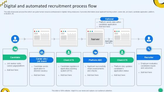 This slide showcases process flow which can guide human resource professionals in digitally hiring employees. It provides information about applicant tracking system, career site, job board, candidate application, platform, evaluation, etc. Whether you have daily or monthly meetings, a brilliant presentation is necessary. Digital And Automated Recruitment Enhancing Recruitment Process PPT Presentation can be your best option for delivering a presentation. Represent everything in detail using Digital And Automated Recruitment Enhancing Recruitment Process PPT Presentation and make yourself stand out in meetings. The template is versatile and follows a structure that will cater to your requirements. All the templates prepared by Slidegeeks are easy to download and edit. Our research experts have taken care of the corporate themes as well. So, give it a try and see the results. This slide showcases process flow which can guide human resource professionals in digitally hiring employees. It provides information about applicant tracking system, career site, job board, candidate application, platform, evaluation, etc.
