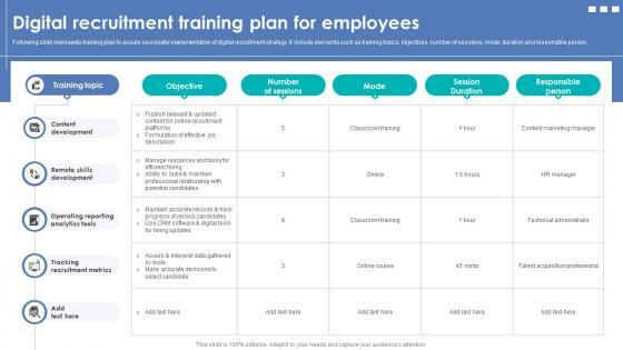 Following slide represents training plan to assure successful implementation of digital recruitment strategy. It include elements such as training topics, objectives, number of sessions, mode, duration and responsible person. Create an editable Digital Recruitment Training Plan For Employees Integrating Automation For Effective Business that communicates your idea and engages your audience. Whether you are presenting a business or an educational presentation, pre-designed presentation templates help save time. Digital Recruitment Training Plan For Employees Integrating Automation For Effective Business is highly customizable and very easy to edit, covering many different styles from creative to business presentations. Slidegeeks has creative team members who have crafted amazing templates. So, go and get them without any delay. Following slide represents training plan to assure successful implementation of digital recruitment strategy. It include elements such as training topics, objectives, number of sessions, mode, duration and responsible person.