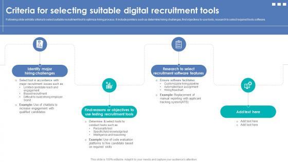 Following slide exhibits criteria to select suitable recruitment tool to optimize hiring process. It include pointers such as determine hiring challenges, find objectives to use tools, research to select required tools software. From laying roadmaps to briefing everything in detail, our templates are perfect for you. You can set the stage with your presentation slides. All you have to do is download these easy-to-edit and customizable templates. Integrating Automation For Effective Business Criteria For Selecting Suitable Digital Recruitment Tools will help you deliver an outstanding performance that everyone would remember and praise you for. Do download this presentation today. Following slide exhibits criteria to select suitable recruitment tool to optimize hiring process. It include pointers such as determine hiring challenges, find objectives to use tools, research to select required tools software.