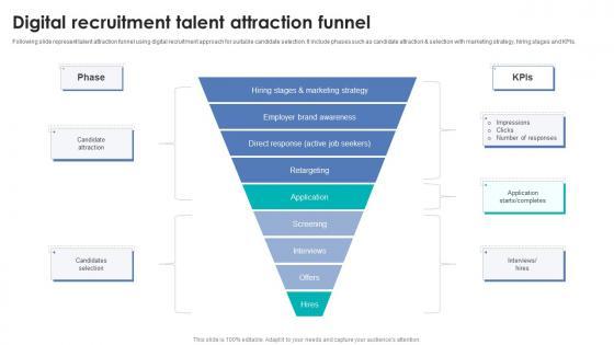 Following slide represent talent attraction funnel using digital recruitment approach for suitable candidate selection. It include phases such as candidate attraction and selection with marketing strategy, hiring stages and KPIs. Slidegeeks is here to make your presentations a breeze with Integrating Automation For Effective Business Digital Recruitment Talent Attraction Funnel With our easy-to-use and customizable templates, you can focus on delivering your ideas rather than worrying about formatting. With a variety of designs to choose from, you are sure to find one that suits your needs. And with animations and unique photos, illustrations, and fonts, you can make your presentation pop. So whether you are giving a sales pitch or presenting to the board, make sure to check out Slidegeeks first Following slide represent talent attraction funnel using digital recruitment approach for suitable candidate selection. It include phases such as candidate attraction and selection with marketing strategy, hiring stages and KPIs.