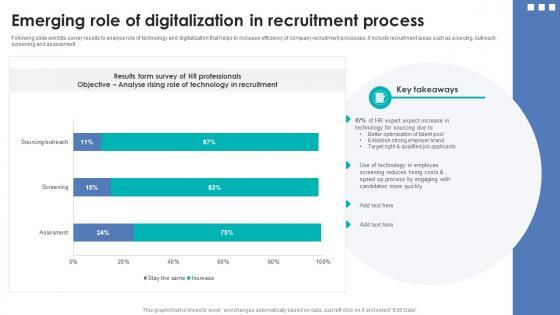 Following slide exhibits survey results to analyse role of technology and digitalization that helps to increase efficiency of company recruitment processes. It include recruitment areas such as sourcing, outreach, screening and assessment. Do you have an important presentation coming up Are you looking for something that will make your presentation stand out from the rest Look no further than Integrating Automation For Effective Business Emerging Role Of Digitalization In Recruitment Process. With our professional designs, you can trust that your presentation will pop and make delivering it a smooth process. And with Slidegeeks, you can trust that your presentation will be unique and memorable. So why wait Grab Integrating Automation For Effective Business Emerging Role Of Digitalization In Recruitment Process today and make your presentation stand out from the rest Following slide exhibits survey results to analyse role of technology and digitalization that helps to increase efficiency of company recruitment processes. It include recruitment areas such as sourcing, outreach, screening and assessment.