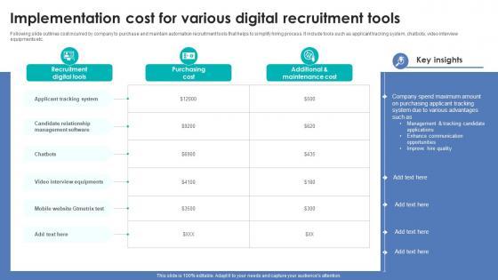 Following slide outlines cost incurred by company to purchase and maintain automation recruitment tools that helps to simplify hiring process. It include tools such as applicant tracking system, chatbots, video interview equipments etc. Are you in need of a template that can accommodate all of your creative concepts This one is crafted professionally and can be altered to fit any style. Use it with Google Slides or PowerPoint. Include striking photographs, symbols, depictions, and other visuals. Fill, move around, or remove text boxes as desired. Test out color palettes and font mixtures. Edit and save your work, or work with colleagues. Download Integrating Automation For Effective Business Implementation Cost For Various Digital Recruitment and observe how to make your presentation outstanding. Give an impeccable presentation to your group and make your presentation unforgettable. Following slide outlines cost incurred by company to purchase and maintain automation recruitment tools that helps to simplify hiring process. It include tools such as applicant tracking system, chatbots, video interview equipments etc.