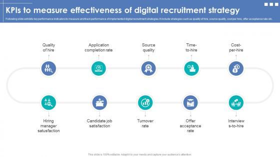 Following slide exhibits key performance indicators to measure and track performance of implemented digital recruitment strategies. It include strategies such as quality of hire, source quality, cost per hire, offer acceptance rate etc. Make sure to capture your audiences attention in your business displays with our gratis customizable Integrating Automation For Effective Business Kpis To Measure Effectiveness Of Digital Recruitment. These are great for business strategies, office conferences, capital raising or task suggestions. If you desire to acquire more customers for your tech business and ensure they stay satisfied, create your own sales presentation with these plain slides. Following slide exhibits key performance indicators to measure and track performance of implemented digital recruitment strategies. It include strategies such as quality of hire, source quality, cost per hire, offer acceptance rate etc.
