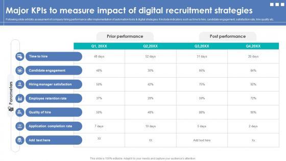 Following slide exhibits assessment of company hiring performance after implementation of automation tools and digital strategies. It include indicators such as time to hire, candidate engagement, satisfaction rate, hire quality etc. Formulating a presentation can take up a lot of effort and time, so the content and message should always be the primary focus. The visuals of the PowerPoint can enhance the presenters message, so our Integrating Automation For Effective Business Major Kpis To Measure Impact Of Digital Recruitment was created to help save time. Instead of worrying about the design, the presenter can concentrate on the message while our designers work on creating the ideal templates for whatever situation is needed. Slidegeeks has experts for everything from amazing designs to valuable content, we have put everything into Integrating Automation For Effective Business Major Kpis To Measure Impact Of Digital Recruitment. Following slide exhibits assessment of company hiring performance after implementation of automation tools and digital strategies. It include indicators such as time to hire, candidate engagement, satisfaction rate, hire quality etc.