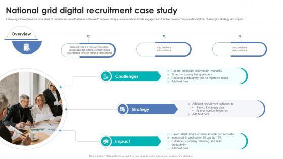 Following slide represents case study of recruitment team that uses software to improve hiring process and candidate engagement. It further covers company description, challenges, strategy and impact. This modern and well-arranged Integrating Automation For Effective Business National Grid Digital Recruitment Case Study provides lots of creative possibilities. It is very simple to customize and edit with the Powerpoint Software. Just drag and drop your pictures into the shapes. All facets of this template can be edited with Powerpoint, no extra software is necessary. Add your own material, put your images in the places assigned for them, adjust the colors, and then you can show your slides to the world, with an animated slide included. Following slide represents case study of recruitment team that uses software to improve hiring process and candidate engagement. It further covers company description, challenges, strategy and impact.