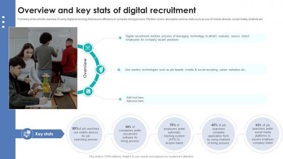 This slide showcases overview of digital recruitment to make HRs familiar with basic aspects of hiring technology. It includes key statistics, purpose along with generic process, smartphone job seeking, HR workload, candidate engagement, etc. Find highly impressive Digital Recruitment Overview Stats Enhancing Recruitment Process PPT Presentation on Slidegeeks to deliver a meaningful presentation. You can save an ample amount of time using these presentation templates. No need to worry to prepare everything from scratch because Slidegeeks experts have already done a huge research and work for you. You need to download Digital Recruitment Overview Stats Enhancing Recruitment Process PPT Presentation for your upcoming presentation. All the presentation templates are 100 percent editable and you can change the color and personalize the content accordingly. Download now This slide showcases overview of digital recruitment to make HRs familiar with basic aspects of hiring technology. It includes key statistics, purpose along with generic process, smartphone job seeking, HR workload, candidate engagement, etc.