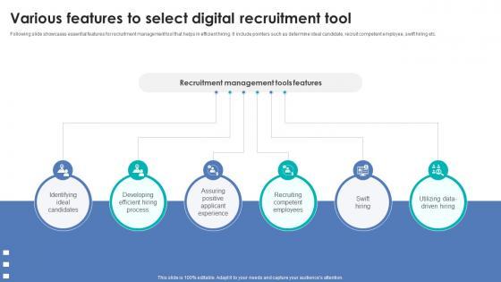 Following slide showcases essential features for recruitment management tool that helps in efficient hiring. It include pointers such as determine ideal candidate, recruit competent employee, swift hiring etc. Present like a pro with Integrating Automation For Effective Business Various Features To Select Digital Recruitment Tool. Create beautiful presentations together with your team, using our easy-to-use presentation slides. Share your ideas in real-time and make changes on the fly by downloading our templates. So whether you are in the office, on the go, or in a remote location, you can stay in sync with your team and present your ideas with confidence. With Slidegeeks presentation got a whole lot easier. Grab these presentations today. Following slide showcases essential features for recruitment management tool that helps in efficient hiring. It include pointers such as determine ideal candidate, recruit competent employee, swift hiring etc.