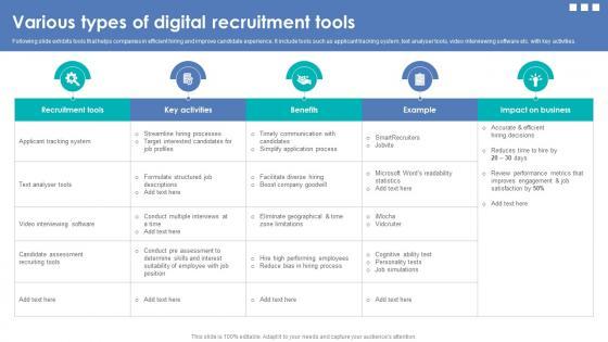 Following slide exhibits tools that helps companies in efficient hiring and improve candidate experience. It include tools such as applicant tracking system, text analyser tools, video interviewing software etc. with key activities. Whether you have daily or monthly meetings, a brilliant presentation is necessary. Integrating Automation For Effective Business Various Types Of Digital Recruitment Tools can be your best option for delivering a presentation. Represent everything in detail using Integrating Automation For Effective Business Various Types Of Digital Recruitment Tools and make yourself stand out in meetings. The template is versatile and follows a structure that will cater to your requirements. All the templates prepared by Slidegeeks are easy to download and edit. Our research experts have taken care of the corporate themes as well. So, give it a try and see the results. Following slide exhibits tools that helps companies in efficient hiring and improve candidate experience. It include tools such as applicant tracking system, text analyser tools, video interviewing software etc. with key activities.