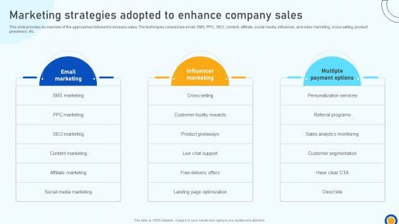 This slide provides an overview of the approaches followed to increase sales. The techniques covered are email, SMS, PPC, SEO, content, affiliate, social media, influencer, and video marketing, cross-selling, product giveaways, etc. Are you searching for a Digital Marketing Strategies Marketing Strategies Adopted To Enhance Company Sales SA SS V that is uncluttered, straightforward, and original Its easy to edit, and you can change the colors to suit your personal or business branding. For a presentation that expresses how much effort you have put in, this template is ideal With all of its features, including tables, diagrams, statistics, and lists, its perfect for a business plan presentation. Make your ideas more appealing with these professional slides. Download Digital Marketing Strategies Marketing Strategies Adopted To Enhance Company Sales SA SS V from Slidegeeks today. This slide provides an overview of the approaches followed to increase sales. The techniques covered are email, SMS, PPC, SEO, content, affiliate, social media, influencer, and video marketing, cross-selling, product giveaways, etc.