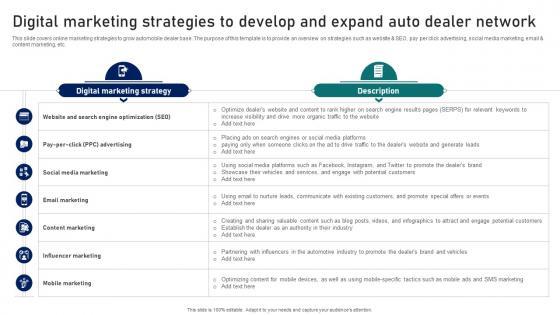 This slide covers online marketing strategies to grow automobile dealer base. The purpose of this template is to provide an overview on strategies such as website and SEO, pay per click advertising, social media marketing, email and content marketing, etc. Slidegeeks is here to make your presentations a breeze with Ultimate Guide To Developing Digital Marketing Strategies To Develop And Expand Auto Strategy SS V With our easy-to-use and customizable templates, you can focus on delivering your ideas rather than worrying about formatting. With a variety of designs to choose from, you are sure to find one that suits your needs. And with animations and unique photos, illustrations, and fonts, you can make your presentation pop. So whether you are giving a sales pitch or presenting to the board, make sure to check out Slidegeeks first This slide covers online marketing strategies to grow automobile dealer base. The purpose of this template is to provide an overview on strategies such as website and SEO, pay per click advertising, social media marketing, email and content marketing, etc.