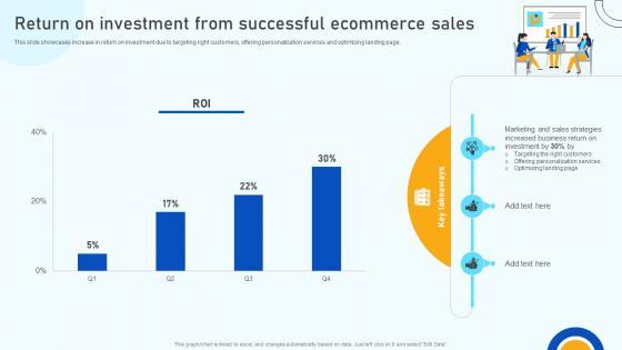 This slide showcases increase in return on investment due to targeting right customers, offering personalization services and optimizing landing page. Find a pre-designed and impeccable Digital Marketing Strategies Return On Investment From Successful Ecommerce Sales SA SS V. The templates can ace your presentation without additional effort. You can download these easy-to-edit presentation templates to make your presentation stand out from others. So, what are you waiting for Download the template from Slidegeeks today and give a unique touch to your presentation. This slide showcases increase in return on investment due to targeting right customers, offering personalization services and optimizing landing page.