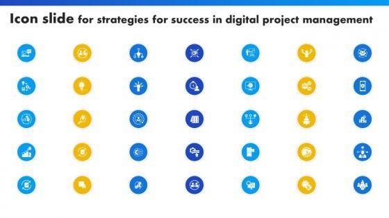 Introducing our well designed Icon Slide For Strategies For Success In Digital Project Management set of slides. The slide displays editable icons to enhance your visual presentation. The icons can be edited easily. So customize according to your business to achieve a creative edge. Download and share it with your audience. Our Icon Slide For Strategies For Success In Digital Project Management are topically designed to provide an attractive backdrop to any subject. Use them to look like a presentation pro.