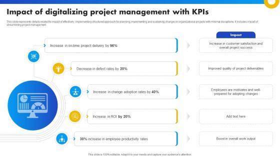 This slide represents details related to impact of effectively implementing structured approach for planning, implementing and sustaining changes in organizational projects with minimal disruptions. It includes impact of streamlining project management. Make sure to capture your audiences attention in your business displays with our gratis customizable Impact Of Digitalizing Project Management With Kpis Strategies For Success In Digital. These are great for business strategies, office conferences, capital raising or task suggestions. If you desire to acquire more customers for your tech business and ensure they stay satisfied, create your own sales presentation with these plain slides. This slide represents details related to impact of effectively implementing structured approach for planning, implementing and sustaining changes in organizational projects with minimal disruptions. It includes impact of streamlining project management.