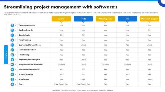 The purpose of the mentioned slide is to outline various features of different project management digital tools. It includes features such as task management, kanban boards, Gantt charts, time tracking, customizable workflows, team collaboration, etc. There are so many reasons you need a Streamlining Project Management With Softwares Strategies For Success In Digital. The first reason is you can not spend time making everything from scratch, Thus, Slidegeeks has made presentation templates for you too. You can easily download these templates from our website easily. The purpose of the mentioned slide is to outline various features of different project management digital tools. It includes features such as task management, kanban boards, Gantt charts, time tracking, customizable workflows, team collaboration, etc.