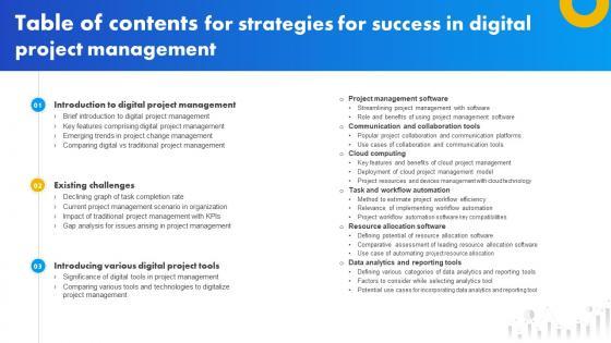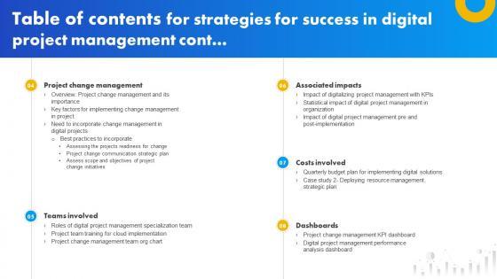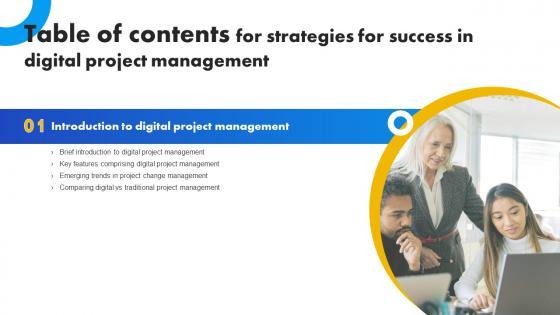 Get a simple yet stunning designed Table Of Contents Strategies For Success In Digital Project Management. It is the best one to establish the tone in your meetings. It is an excellent way to make your presentations highly effective. So, download this PPT today from Slidegeeks and see the positive impacts. Our easy-to-edit Table Of Contents Strategies For Success In Digital Project Management can be your go-to option for all upcoming conferences and meetings. So, what are you waiting for Grab this template today. Our Table Of Contents Strategies For Success In Digital Project Management are topically designed to provide an attractive backdrop to any subject. Use them to look like a presentation pro.