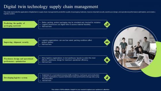 This slide represents the application of digital twin in supply chain management to predict the quality of packaging materials, improve shipment security, warehouse design, and operational performance optimization, and create a logistics system. If your project calls for a presentation, then Slidegeeks is your go-to partner because we have professionally designed, easy-to-edit templates that are perfect for any presentation. After downloading, you can easily edit Iot Integration In Manufacturing Digital Twin Technology Supply Chain Management Slides PDF and make the changes accordingly. You can rearrange slides or fill them with different images. Check out all the handy templates
