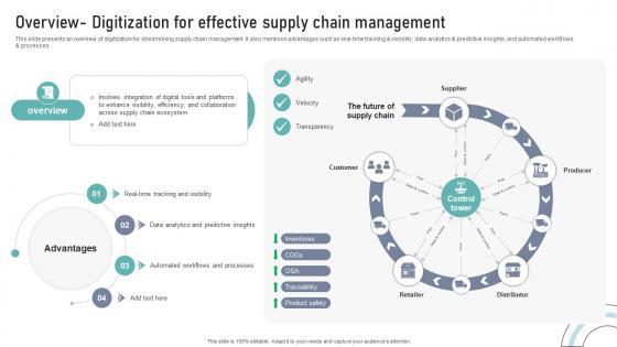 This slide presents an overview of digitization for streamlining supply chain management. It also mentions advantages such as real-time tracking and visibility, data analytics and predictive insights, and automated workflows and processes.If your project calls for a presentation, then Slidegeeks is your go-to partner because we have professionally designed, easy-to-edit templates that are perfect for any presentation. After downloading, you can easily edit Overview Digitization For Effective Supply Chain Management DT SS V and make the changes accordingly. You can rearrange slides or fill them with different images. Check out all the handy templates This slide presents an overview of digitization for streamlining supply chain management. It also mentions advantages such as real-time tracking and visibility, data analytics and predictive insights, and automated workflows and processes.