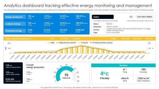 This slide represents an analytics dashboard for effective energy monitoring and management. It tracks KPIs such as energy production, solar energy production, savings, energy produced, carbon savings, and financial savings. Get a simple yet stunning designed Analytics Dashboard Tracking Effective Digital Transformation Journey PPT Presentation DT SS V. It is the best one to establish the tone in your meetings. It is an excellent way to make your presentations highly effective. So, download this PPT today from Slidegeeks and see the positive impacts. Our easy-to-edit Analytics Dashboard Tracking Effective Digital Transformation Journey PPT Presentation DT SS V can be your go-to option for all upcoming conferences and meetings. So, what are you waiting for Grab this template today. This slide represents an analytics dashboard for effective energy monitoring and management. It tracks KPIs such as energy production, solar energy production, savings, energy produced, carbon savings, and financial savings.