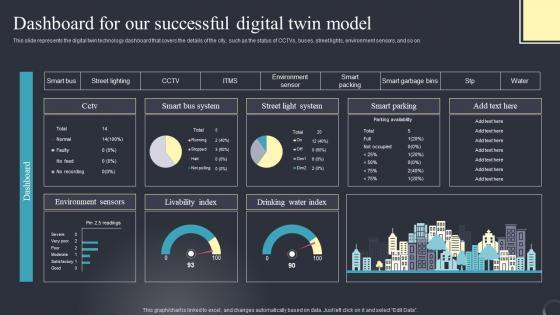 This slide represents the digital twin technology dashboard that covers the details of the city, such as the status of CCTVs, buses, street lights, environment sensors, and so on. Do you have an important presentation coming up Are you looking for something that will make your presentation stand out from the rest Look no further than Dashboard For Our Successful Industrial Transformation Using Digital Twin Pictures Pdf. With our professional designs, you can trust that your presentation will pop and make delivering it a smooth process. And with Slidegeeks, you can trust that your presentation will be unique and memorable. So why wait Grab Dashboard For Our Successful Industrial Transformation Using Digital Twin Pictures Pdf today and make your presentation stand out from the rest This slide represents the digital twin technology dashboard that covers the details of the city, such as the status of CCTVs, buses, street lights, environment sensors, and so on.