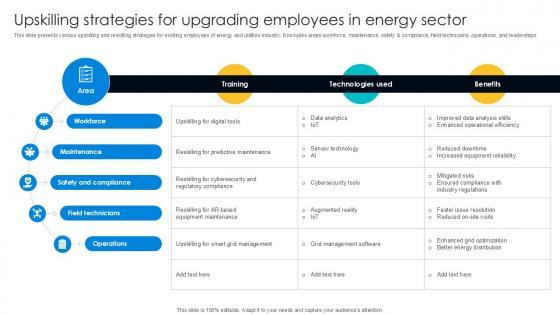 This slide presents various upskilling and reskilling strategies for existing employees of energy and utilities industry. It includes areas workforce, maintenance, safety and compliance, field technicians, operations, and leaderships. Presenting this PowerPoint presentation, titled Safety And Compliance, Field Technicians, Operations, with topics curated by our researchers after extensive research. This editable presentation is available for immediate download and provides attractive features when used. Download now and captivate your audience. Presenting this Safety And Compliance, Field Technicians, Operations. Our researchers have carefully researched and created these slides with all aspects taken into consideration. This is a completely customizable Safety And Compliance, Field Technicians, Operations that is available for immediate downloading. Download now and make an impact on your audience. Highlight the attractive features available with our PPTs. This slide presents various upskilling and reskilling strategies for existing employees of energy and utilities industry. It includes areas workforce, maintenance, safety and compliance, field technicians, operations, and leaderships.
