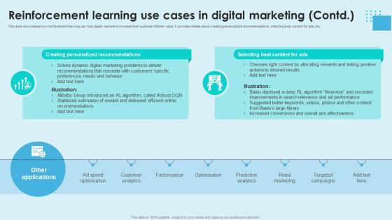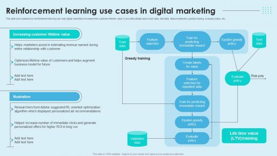 This slide showcases how reinforcement learning can help digital marketers increase their customer lifetime value. It provides details about train data, test data, feature selection, greedy training, evaluate policy, etc. Create an editable Reinforcement Learning Use Cases In Digital Marketing Reinforcement Learning Unveiled AI SS V that communicates your idea and engages your audience. Whether you are presenting a business or an educational presentation, pre-designed presentation templates help save time. Reinforcement Learning Use Cases In Digital Marketing Reinforcement Learning Unveiled AI SS V is highly customizable and very easy to edit, covering many different styles from creative to business presentations. Slidegeeks has creative team members who have crafted amazing templates. So, go and get them without any delay. This slide showcases how reinforcement learning can help digital marketers increase their customer lifetime value. It provides details about train data, test data, feature selection, greedy training, evaluate policy, etc.