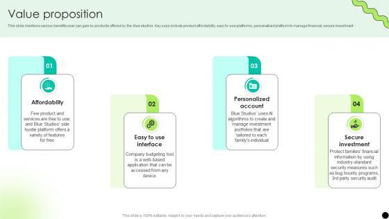 This slide mentions various benefits user can gain by products offered by the blue studios. Key usps include product affordability, easy to use platforms, personalized platform to manage financial, secure investment. Welcome to our selection of the Value Proposition Digital Payment Platform Pitch Deck. These are designed to help you showcase your creativity and bring your sphere to life. Planning and Innovation are essential for any business that is just starting out. This collection contains the designs that you need for your everyday presentations. All of our PowerPoints are 100Percent editable, so you can customize them to suit your needs. This multi-purpose template can be used in various situations. Grab these presentation templates today. This slide mentions various benefits user can gain by products offered by the blue studios. Key usps include product affordability, easy to use platforms, personalized platform to manage financial, secure investment.