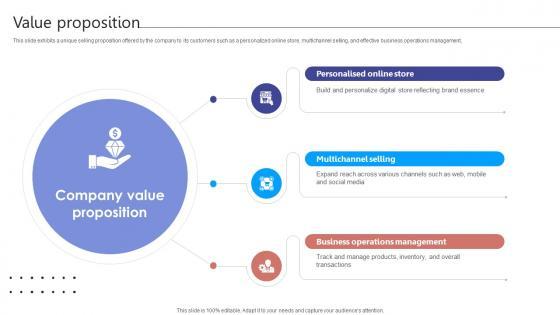 This slide exhibits a unique selling proposition offered by the company to its customers such as a personalized online store, multichannel selling, and effective business operations management. Do you have to make sure that everyone on your team knows about any specific topic I yes, then you should give Value Proposition Digital Storefront Platform Business Model BMC SS V a try. Our experts have put a lot of knowledge and effort into creating this impeccable Value Proposition Digital Storefront Platform Business Model BMC SS V. You can use this template for your upcoming presentations, as the slides are perfect to represent even the tiniest detail. You can download these templates from the Slidegeeks website and these are easy to edit. So grab these today This slide exhibits a unique selling proposition offered by the company to its customers such as a personalized online store, multichannel selling, and effective business operations management.