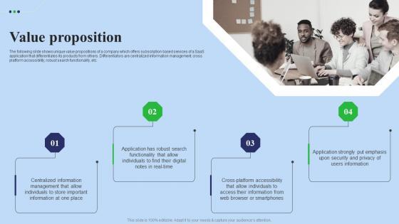 The following slide shows unique value propositions of a company which offers subscription based services of a SaaS application that differentiates its products from others. Differentiators are centralized information management, cross platform accessibility, robust search functionality, etc. Coming up with a presentation necessitates that the majority of the effort goes into the content and the message you intend to convey. The visuals of a PowerPoint presentation can only be effective if it supplements and supports the story that is being told. Keeping this in mind our experts created Value Proposition Fundraising Pitch Deck For Digital Software Company Introduction Pdf to reduce the time that goes into designing the presentation. This way, you can concentrate on the message while our designers take care of providing you with the right template for the situation. The following slide shows unique value propositions of a company which offers subscription based services of a SaaS application that differentiates its products from others. Differentiators are centralized information management, cross platform accessibility, robust search functionality, etc.