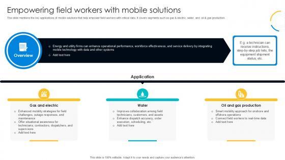 This slide mentions the key applications of mobile solutions that help empower field workers with critical data. It covers segments such as gas and electric, water, and oil and gas production. Do you know about Slidesgeeks Empowering Field Workers With Digital Transformation Journey PPT PowerPoint DT SS V These are perfect for delivering any kind od presentation. Using it, create PowerPoint presentations that communicate your ideas and engage audiences. Save time and effort by using our pre-designed presentation templates that are perfect for a wide range of topic. Our vast selection of designs covers a range of styles, from creative to business, and are all highly customizable and easy to edit. Download as a PowerPoint template or use them as Google Slides themes. This slide mentions the key applications of mobile solutions that help empower field workers with critical data. It covers segments such as gas and electric, water, and oil and gas production.