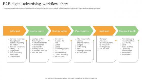 Following slide outlines the flow chart for B2B digital marketing which assist in o communicate with target quickly It includes define goal, analyse, strategic option, etc. Pitch your topic with ease and precision using this B2B Digital Advertising Workflow Chart Introduction Pdf. This layout presents information on Define Goal, Analyse Context, Strategic Options. It is also available for immediate download and adjustment. So, changes can be made in the color, design, graphics or any other component to create a unique layout. Following slide outlines the flow chart for B2B digital marketing which assist in o communicate with target quickly It includes define goal, analyse, strategic option, etc.