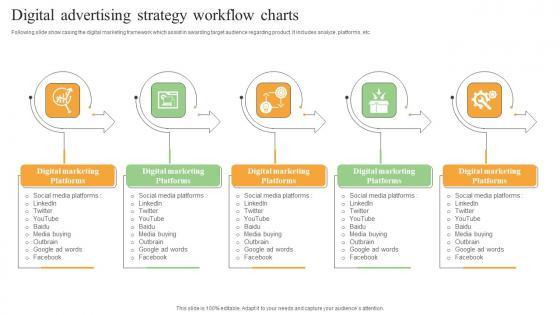 Following slide show casing the digital marketing framework which assist in awarding target audience regarding product. It includes analyze, platforms, etc. Showcasing this set of slides titled Digital Advertising Strategy Workflow Charts Background Pdf. The topics addressed in these templates are Digital Marketing Platforms, Social Media Platforms, Media Buying. All the content presented in this PPT design is completely editable. Download it and make adjustments in color, background, font etc. as per your unique business setting. Following slide show casing the digital marketing framework which assist in awarding target audience regarding product. It includes analyze, platforms, etc.