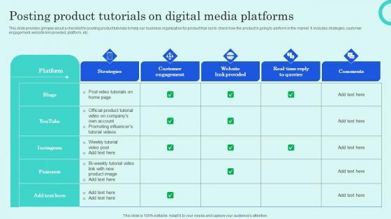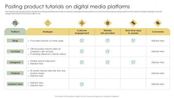 This slide provides glimpse about a checklist for posting product tutorials to help our business organization for product trial run to check how the product is going to perform in the market. It includes strategies, customer engagement, website link provided, platform, etc.This modern and well-arranged Posting Product Tutorials On Digital Media Platforms Analyzing Customer Adoption Journey Slides Pdf provides lots of creative possibilities. It is very simple to customize and edit with the Powerpoint Software. Just drag and drop your pictures into the shapes. All facets of this template can be edited with Powerpoint no extra software is necessary. Add your own material, put your images in the places assigned for them, adjust the colors, and then you can show your slides to the world, with an animated slide included. This slide provides glimpse about a checklist for posting product tutorials to help our business organization for product trial run to check how the product is going to perform in the market. It includes strategies, customer engagement, website link provided, platform, etc.