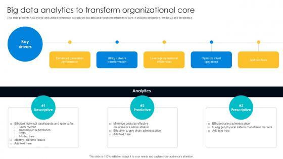 This slide presents how energy and utilities companies are utilizing big data analytics to transform their core. It includes descriptive, predictive and prescriptive. Whether you have daily or monthly meetings, a brilliant presentation is necessary. Big Data Analytics To Transform Digital Transformation Journey PPT Template DT SS V can be your best option for delivering a presentation. Represent everything in detail using Big Data Analytics To Transform Digital Transformation Journey PPT Template DT SS V and make yourself stand out in meetings. The template is versatile and follows a structure that will cater to your requirements. All the templates prepared by Slidegeeks are easy to download and edit. Our research experts have taken care of the corporate themes as well. So, give it a try and see the results. This slide presents how energy and utilities companies are utilizing big data analytics to transform their core. It includes descriptive, predictive and prescriptive.