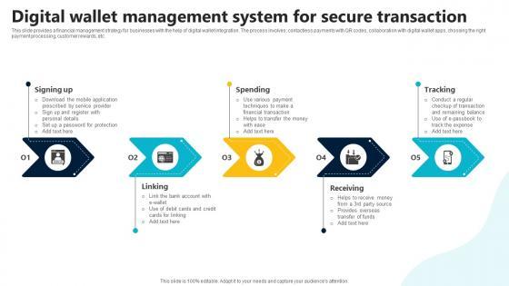 This slide provides a financial management strategy for businesses with the help of digital wallet integration. The process involves contactless payments with QR codes, collaboration with digital wallet apps, choosing the right payment processing, customer rewards, etc. Find highly impressive Digital Wallet Management System For Secure In Depth Guide To Digital Wallets Fin SS V on Slidegeeks to deliver a meaningful presentation. You can save an ample amount of time using these presentation templates. No need to worry to prepare everything from scratch because Slidegeeks experts have already done a huge research and work for you. You need to download Digital Wallet Management System For Secure In Depth Guide To Digital Wallets Fin SS V for your upcoming presentation. All the presentation templates are 100 percent editable and you can change the color and personalize the content accordingly. Download now This slide provides a financial management strategy for businesses with the help of digital wallet integration. The process involves contactless payments with QR codes, collaboration with digital wallet apps, choosing the right payment processing, customer rewards, etc.