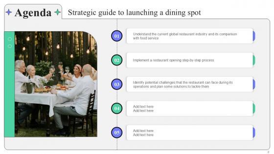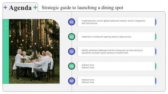 Find a pre-designed and impeccable Agend Strategic Guide To Launching A Dining Spot Ppt Powerpoint. The templates can ace your presentation without additional effort. You can download these easy-to-edit presentation templates to make your presentation stand out from others. So, what are you waiting for Download the template from Slidegeeks today and give a unique touch to your presentation. Our Agend Strategic Guide To Launching A Dining Spot Ppt Powerpoint are topically designed to provide an attractive backdrop to any subject. Use them to look like a presentation pro.