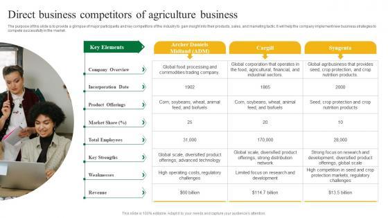 The purpose of this slide is to provide a glimpse of major participants and key competitors of the industry to gain insight into their products, sales, and marketing tactic. It will help the company implement new business strategies to compete successfully in the market. Get a simple yet stunning designed Agriculture Business Plan Go To Market Strategy Direct Business Competitors Of Agriculture Slides Pdf. It is the best one to establish the tone in your meetings. It is an excellent way to make your presentations highly effective. So, download this PPT today from Slidegeeks and see the positive impacts. Our easy to edit Agriculture Business Plan Go To Market Strategy Direct Business Competitors Of Agriculture Slides Pdf can be your go to option for all upcoming conferences and meetings. So, what are you waiting for Grab this template today. The purpose of this slide is to provide a glimpse of major participants and key competitors of the industry to gain insight into their products, sales, and marketing tactic. It will help the company implement new business strategies to compete successfully in the market.