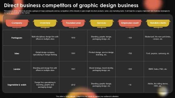The purpose of this slide is to provide a glimpse of major participants and key competitors of the industry to gain insight into their products, sales, and marketing tactic. It will help the company implement new business strategies to compete successfully in the market. Get a simple yet stunning designed Creative Agency Business Plan Direct Business Competitors Of Graphic Design Business BP SS V. It is the best one to establish the tone in your meetings. It is an excellent way to make your presentations highly effective. So, download this PPT today from Slidegeeks and see the positive impacts. Our easy-to-edit Creative Agency Business Plan Direct Business Competitors Of Graphic Design Business BP SS V can be your go-to option for all upcoming conferences and meetings. So, what are you waiting for Grab this template today. The purpose of this slide is to provide a glimpse of major participants and key competitors of the industry to gain insight into their products, sales, and marketing tactic. It will help the company implement new business strategies to compete successfully in the market.