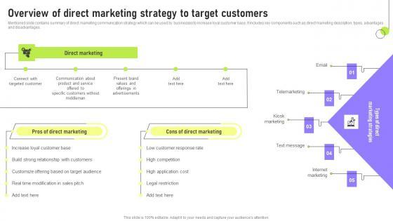 Mentioned slide contains summary of direct marketing communication strategy which can be used by businesses to increase loyal customer base. It includes key components such as direct marketing description, types, advantages and disadvantages. Get a simple yet stunning designed Overview Of Direct Marketing Strategy Marketing Mix Communication Guide Client Template Pdf. It is the best one to establish the tone in your meetings. It is an excellent way to make your presentations highly effective. So, download this PPT today from Slidegeeks and see the positive impacts. Our easy to edit Overview Of Direct Marketing Strategy Marketing Mix Communication Guide Client Template Pdf can be your go to option for all upcoming conferences and meetings. So, what are you waiting for Grab this template today. Mentioned slide contains summary of direct marketing communication strategy which can be used by businesses to increase loyal customer base. It includes key components such as direct marketing description, types, advantages and disadvantages.