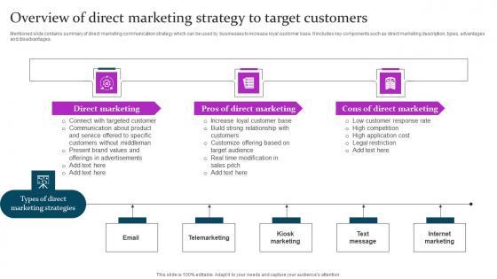 Mentioned slide contains summary of direct marketing communication strategy which can be used by businesses to increase loyal customer base. It includes key components such as direct marketing description, types, advantages and disadvantages. Create an editable Overview Of Direct Marketing Strategy Deployment Of Marketing Communication Diagrams Pdf that communicates your idea and engages your audience. Whether you are presenting a business or an educational presentation, pre designed presentation templates help save time. Overview Of Direct Marketing Strategy Deployment Of Marketing Communication Diagrams Pdf is highly customizable and very easy to edit, covering many different styles from creative to business presentations. Slidegeeks has creative team members who have crafted amazing templates. So, go and get them without any delay. Mentioned slide contains summary of direct marketing communication strategy which can be used by businesses to increase loyal customer base. It includes key components such as direct marketing description, types, advantages and disadvantages.