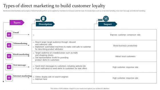 Mentioned slide illustrates various types of direct marketing which can be applied by marketers to increase customer base. It includes types such as email, telemarketing, kiosk, text message, and internet marketing. The best PPT templates are a great way to save time, energy, and resources. Slidegeeks have 100 percent editable powerpoint slides making them incredibly versatile. With these quality presentation templates, you can create a captivating and memorable presentation by combining visually appealing slides and effectively communicating your message. Download Types Of Direct Marketing To Build Deployment Of Marketing Communication Clipart Pdf from Slidegeeks and deliver a wonderful presentation. Mentioned slide illustrates various types of direct marketing which can be applied by marketers to increase customer base. It includes types such as email, telemarketing, kiosk, text message, and internet marketing.