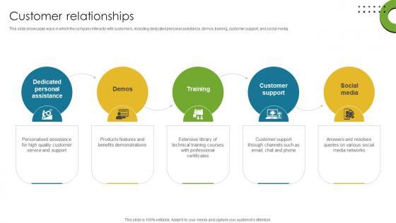 This slide showcases ways in which the company interacts with customers, including dedicated personal assistance, demos, training, customer support, and social media. Slidegeeks is one of the best resources for PowerPoint templates. You can download easily and regulate Customer Relationships Direct To Consumer Computer Manufacturing Business Model BMC SS V for your personal presentations from our wonderful collection. A few clicks is all it takes to discover and get the most relevant and appropriate templates. Use our Templates to add a unique zing and appeal to your presentation and meetings. All the slides are easy to edit and you can use them even for advertisement purposes. This slide showcases ways in which the company interacts with customers, including dedicated personal assistance, demos, training, customer support, and social media.