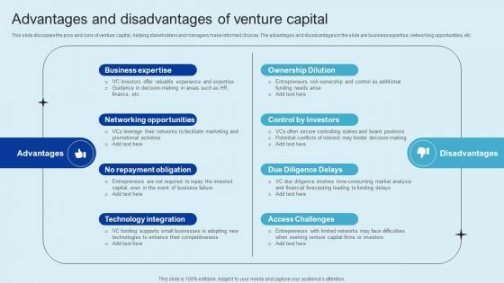 This slide discusses the pros and cons of venture capital, helping stakeholders and managers make informed choices. The advantages and disadvantages in the slide are business expertise, networking opportunities, etc. Boost your pitch with our creative Advantages And Disadvantages Of Raising Venture Capital A Holistic Approach Fin SS V. Deliver an awe-inspiring pitch that will mesmerize everyone. Using these presentation templates you will surely catch everyones attention. You can browse the ppts collection on our website. We have researchers who are experts at creating the right content for the templates. So you do not have to invest time in any additional work. Just grab the template now and use them. This slide discusses the pros and cons of venture capital, helping stakeholders and managers make informed choices. The advantages and disadvantages in the slide are business expertise, networking opportunities, etc.