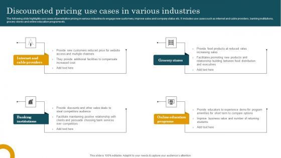 Showcasing this set of slides titled Discouneted Pricing Use Cases In Various Industries Formats Pdf The topics addressed in these templates are Internet And Cable Providers, Banking Institutions, Grocery Stores All the content presented in this PPT design is completely editable. Download it and make adjustments in color, background, font etc. as per your unique business setting. The following slide highlights use cases of penetration pricing in various industries to engage new customers, improve sales and company status etc. It includes use cases such as internet and cable providers, banking institutions, grocery stores and online education programs etc.