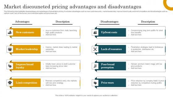 The following slide highlights disadvantages and advantages of penetration pricing. It includes advantages such as new customers entry, market leadership, improve brand loyalty and limit competition and disadvantages such as upfront costs, lack of resources, poor brand perception and price wars etc. Showcasing this set of slides titled Market Discouneted Pricing Advantages And Disadvantages Designs Pdf The topics addressed in these templates are New Customers, Market Leadership, Limit Competition All the content presented in this PPT design is completely editable. Download it and make adjustments in color, background, font etc. as per your unique business setting. The following slide highlights disadvantages and advantages of penetration pricing. It includes advantages such as new customers entry, market leadership, improve brand loyalty and limit competition and disadvantages such as upfront costs, lack of resources, poor brand perception and price wars etc.