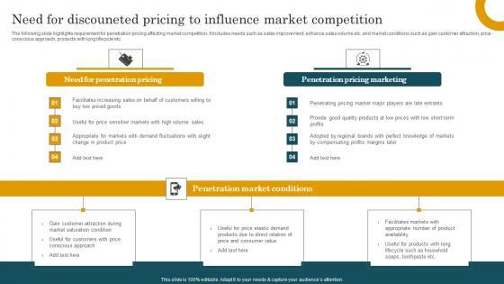 The following slide highlights requirement for penetration pricing affecting market competition. It includes needs such as sales improvement, enhance sales volume etc. and market conditions such as gain customer attraction, price conscious approach, products with long lifecycle etc. Pitch your topic with ease and precision using this Need For Discouneted Pricing To Influence Market Competition Summary Pdf This layout presents information on Penetration Pricing, Penetration Pricing Marketing It is also available for immediate download and adjustment. So, changes can be made in the color, design, graphics or any other component to create a unique layout. The following slide highlights requirement for penetration pricing affecting market competition. It includes needs such as sales improvement, enhance sales volume etc. and market conditions such as gain customer attraction, price conscious approach, products with long lifecycle etc.