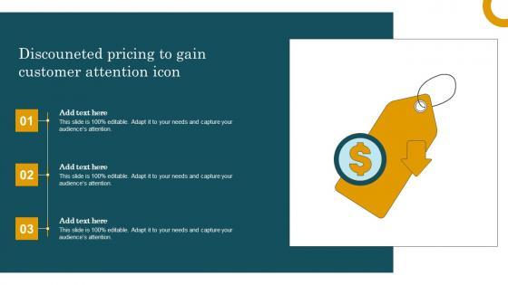 Showcasing this set of slides titled Discouneted Pricing To Gain Customer Attention Icon Formats Pdf The topics addressed in these templates are Discouneted Pricing To Gain, Customer Attention Icon All the content presented in this PPT design is completely editable. Download it and make adjustments in color, background, font etc. as per your unique business setting. Our Discouneted Pricing To Gain Customer Attention Icon Formats Pdf are topically designed to provide an attractive backdrop to any subject. Use them to look like a presentation pro.