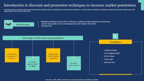 This slide provides an overview of the discount and promotion techniques used by organizations to increase market penetration. The slide includes advantages and strategies adopted that are provide loyalty rewards, free shipping offers, BOGO offers and flash sales. From laying roadmaps to briefing everything in detail, our templates are perfect for you. You can set the stage with your presentation slides. All you have to do is download these easy to edit and customizable templates. Introduction To Discount And Promotion Techniques To Increase Market Penetration Infographics PDF will help you deliver an outstanding performance that everyone would remember and praise you for. Do download this presentation today.