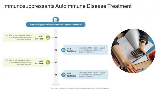 Presenting our innovatively designed set of slides titled Immunosuppressants Autoimmune Disease Treatment In Powerpoint And Google Slides Cpb This completely editable PowerPoint graphic exhibits Immunosuppressants Autoimmune Disease Treatment that will help you convey the message impactfully. It can be accessed with Google Slides and is available in both standard screen and widescreen aspect ratios. Apart from this, you can download this well structured PowerPoint template design in different formats like PDF, JPG, and PNG. So, click the download button now to gain full access to this PPT design. Our Immunosuppressants Autoimmune Disease Treatment In Powerpoint And Google Slides Cpb are topically designed to provide an attractive backdrop to any subject. Use them to look like a presentation pro.